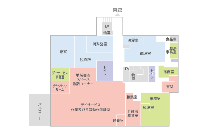 | 館内の設備(全館) | 【1F】 相談室×2、事務室、介護者教育室、医務室、静養室、食堂、日常動作訓練室、調理室、洗濯室、ボランティアルーム、集会室 【2F】 食堂、日常動作訓練室、地域交流スペース、家族室、談話コーナー、リハビリ室 |