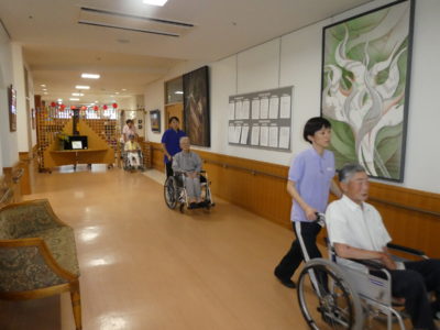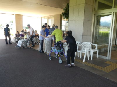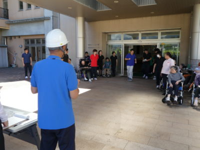 本館1階の厨房から出火したとの想定で、デイサービスのご利用者の皆様や、障害者支援施設ひゞきの入所者の皆様も訓練に参加されました。