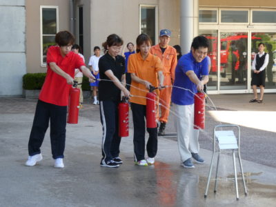 新人職員や、勤続年数の浅い職員を中心に、消火器の使い方を練習しました。