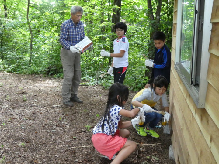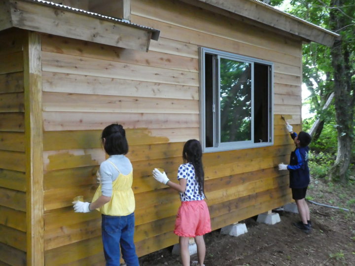 「山小屋チーム」は、魚津市北山地区へ。完成間近の山小屋に行き、みんなで壁に木材保護塗料を塗りました。