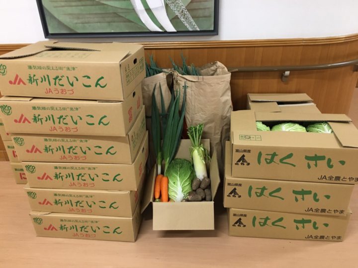 富山市で行われた贈呈式に出席し、たくさんの立派な野菜をいただきました。