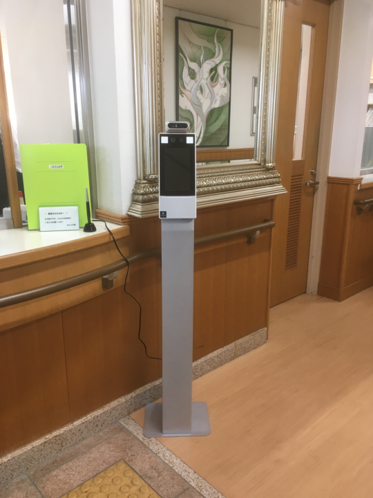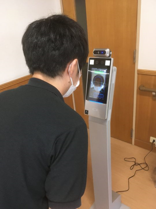 これまでは、事務スタッフがお客様や出入り業者の方が来られる度に、非接触型の体温計を使っていましたが、今後はこの機械に顔を近づけていただくだけで体温を計測できます。